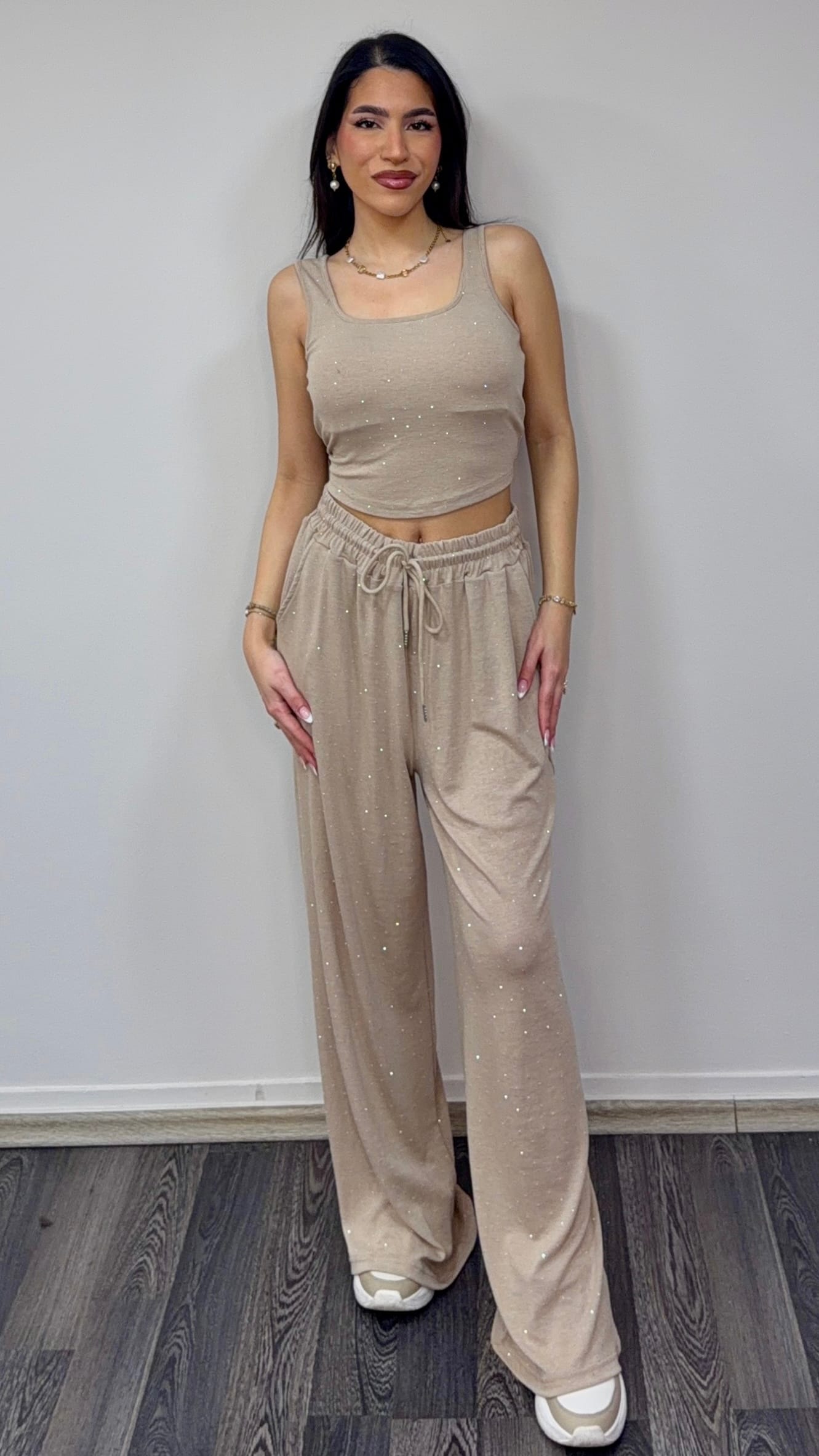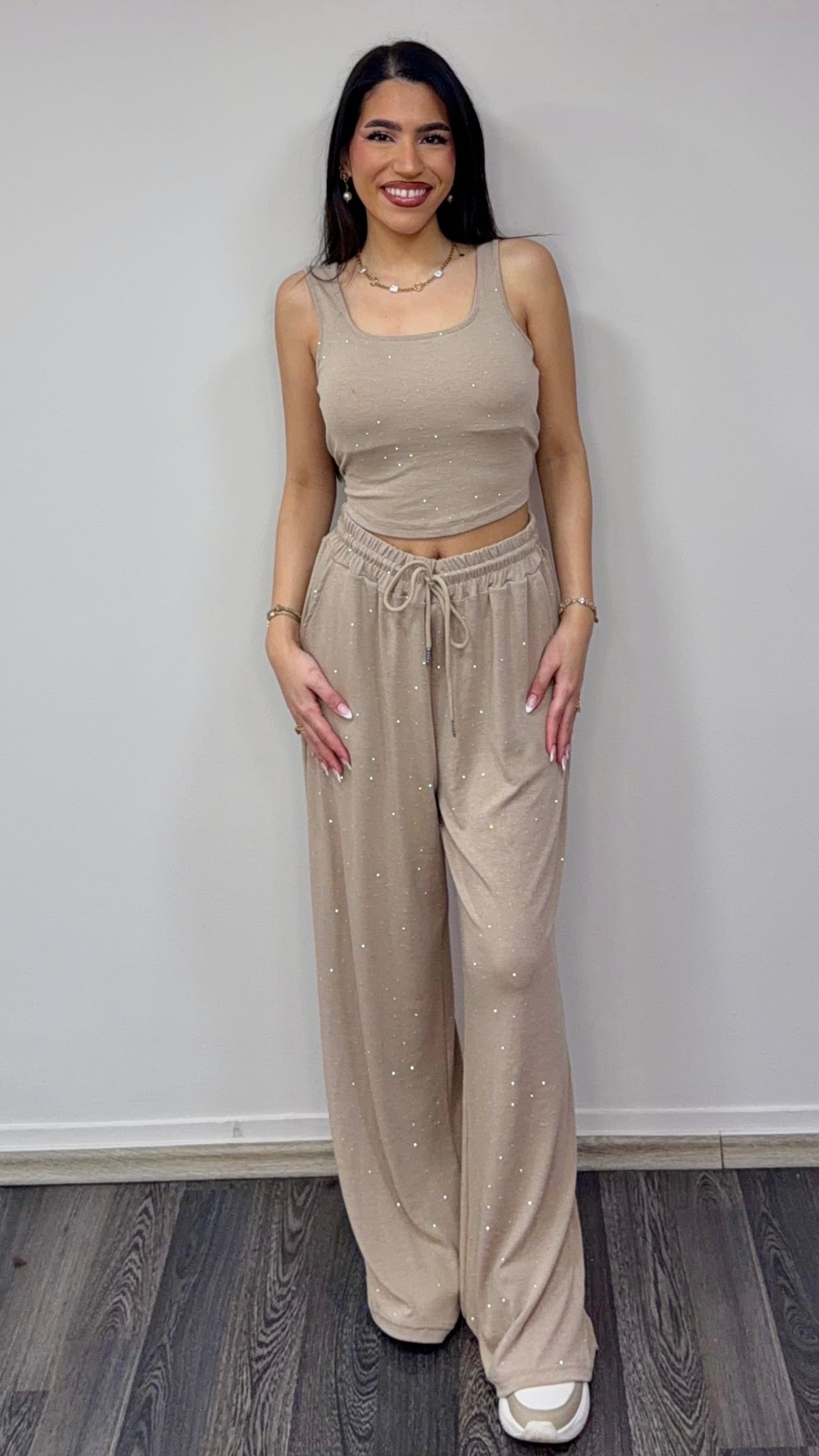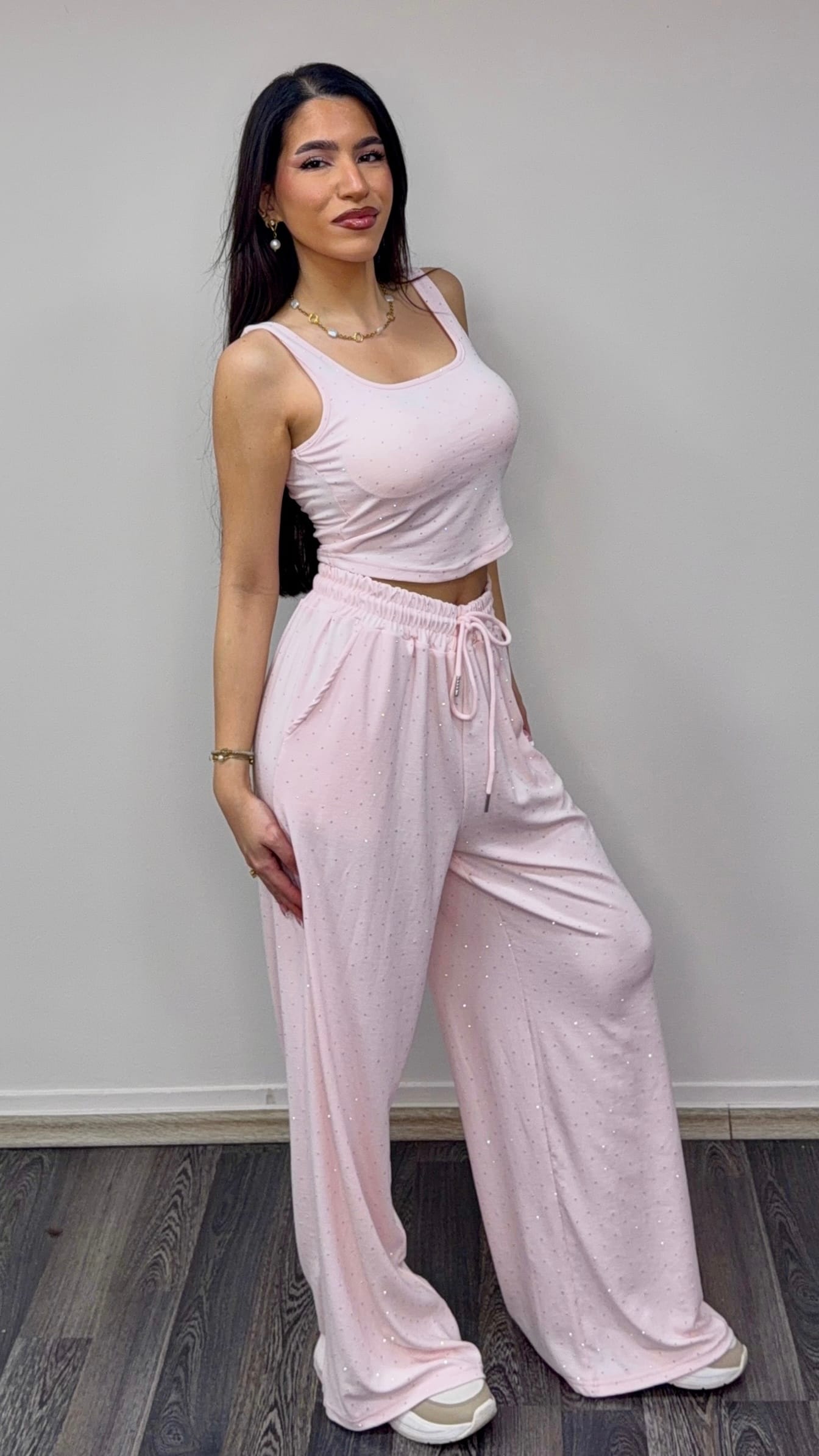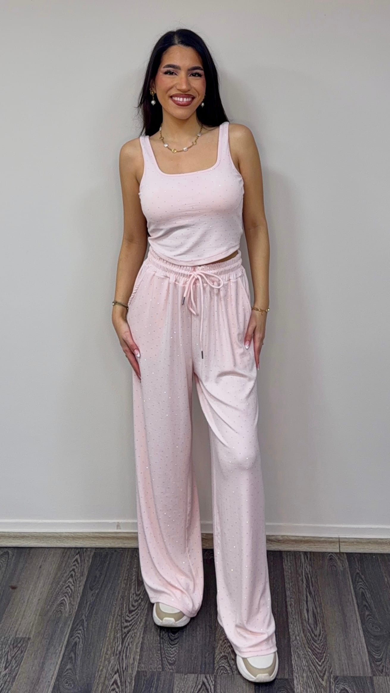 Το Σετ Με Τοπ Και Παντελόνα Σε Άνετη Γραμμή Με Strass Λεπτομέρειες είναι η ιδανική επιλογή για καθημερινές εμφανίσεις με στυλ. Το απαλό και ελαστικό ύφασμα προσφέρει άνεση και ελευθερία κινήσεων, ενώ οι διακριτικές strass λεπτομέρειες χαρίζουν μία ιδιαίτερη λάμψη που κάνει το σύνολο να ξεχωρίζει. Το τοπ με φαρδιά τιράντα εφαρμόζει όμορφα στο σώμα, ενώ η παντελόνα με λάστιχο και κορδόνι στη μέση εξασφαλίζει τέλεια εφαρμογή. Η φαρδιά γραμμή της παντελόνας προσφέρει άνεση και κομψή κίνηση. Ένα σετ που φοριέται από το πρωί έως το βράδυ, ιδανικό για βόλτες, ταξίδια και casual εμφανίσεις.