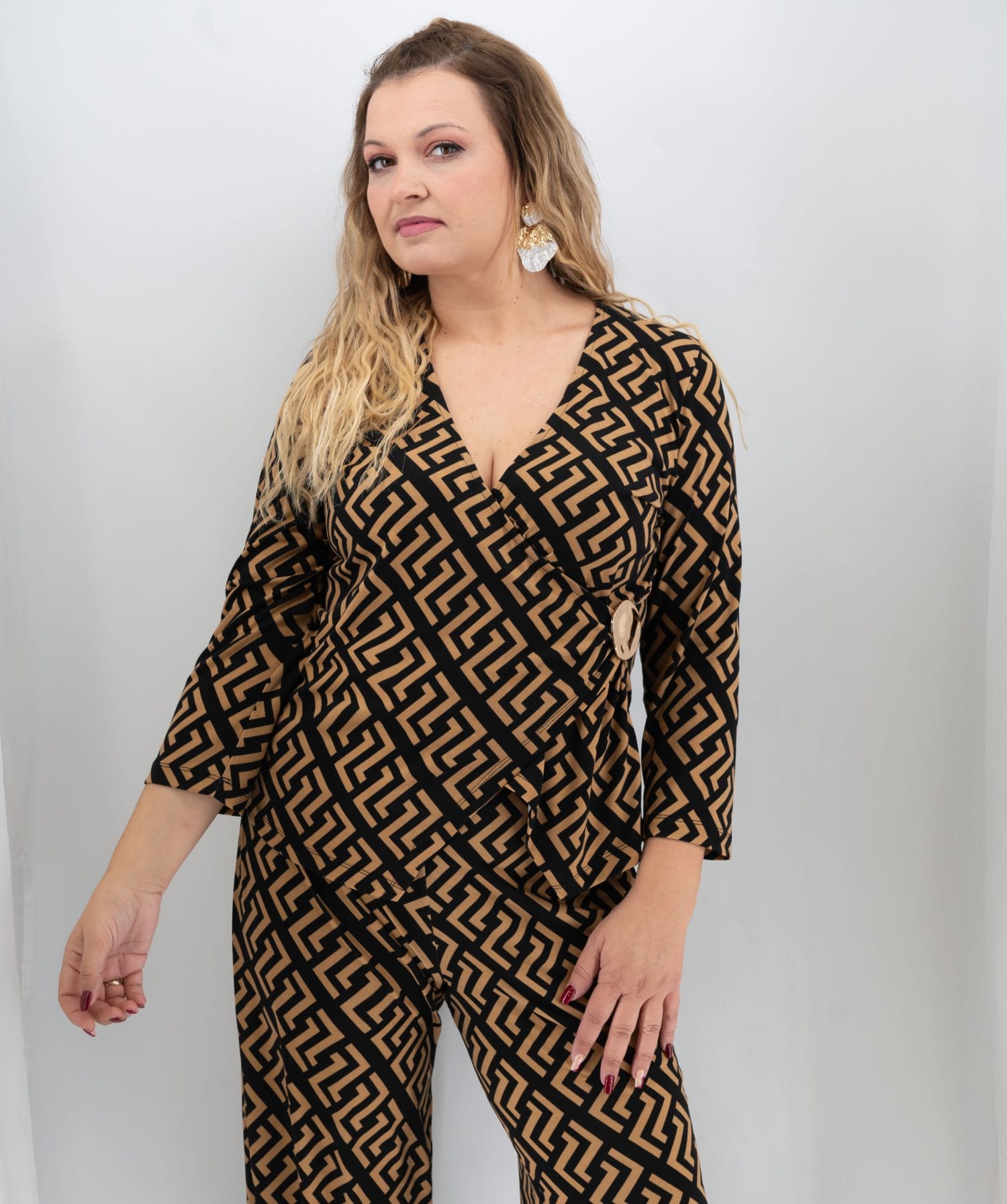 Αν θέλεις ένα κομμάτι που δίνει αμέσως κομψότητα και θηλυκότητα, διάλεξε μπλούζα κρουαζέ εμπριμέ με γεωμετρικό μοτίβο σε μαύρο και χρυσαφί. Η κρουαζέ γραμμή δημιουργεί όμορφη “V” εικόνα στο ντεκολτέ, ενώ παράλληλα αγκαλιάζει σωστά το μπούστο. Έτσι, προσφέρει κολακευτική εφαρμογή σε πολλούς σωματότυπους. Επιπλέον, το διακοσμητικό κουμπί στη μέση προσθέτει elegant λεπτομέρεια που “δένει” το σύνολο.