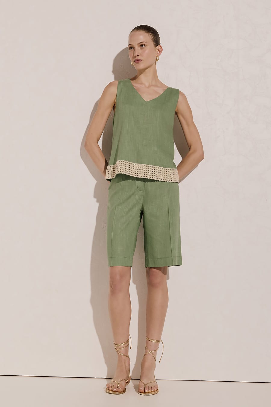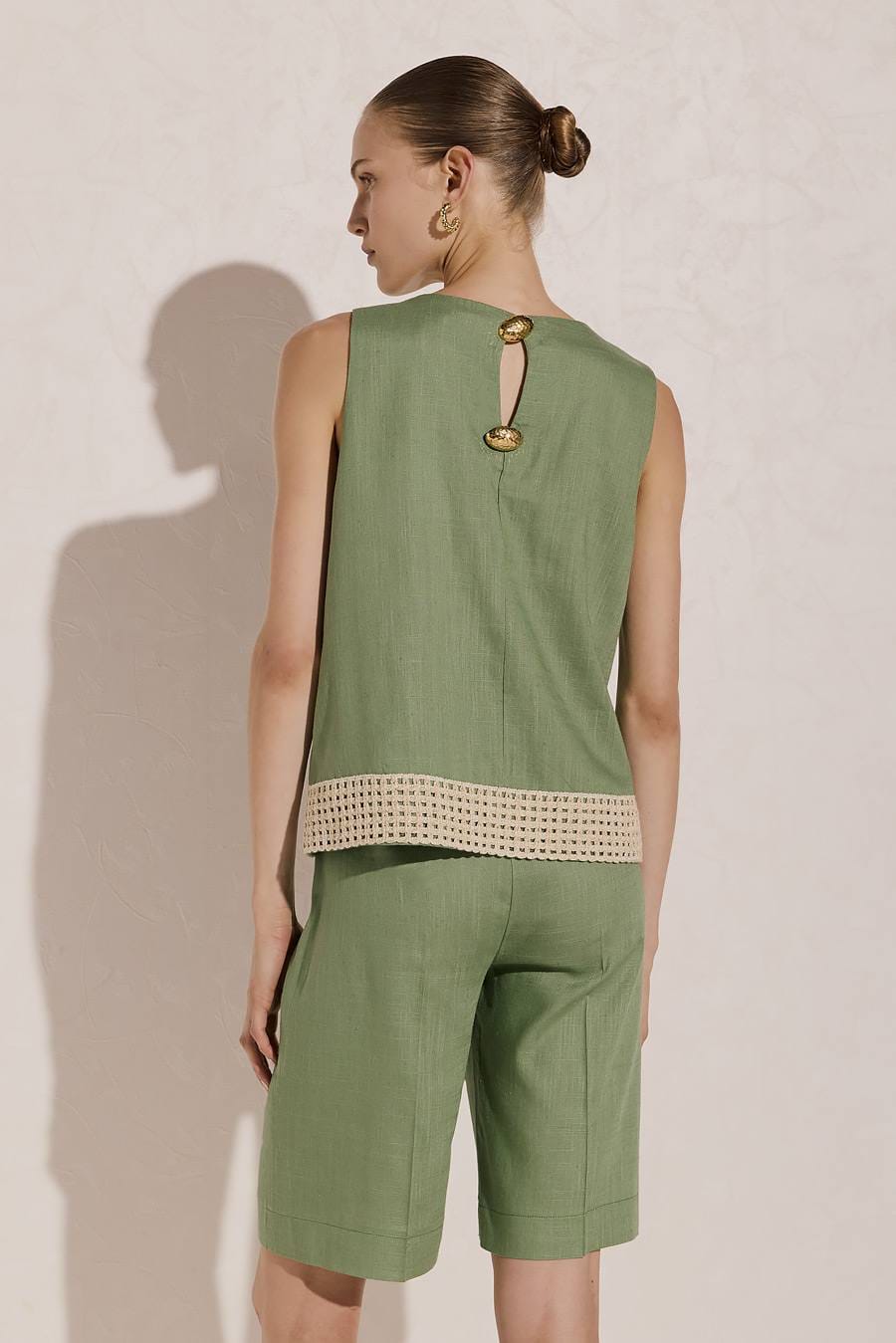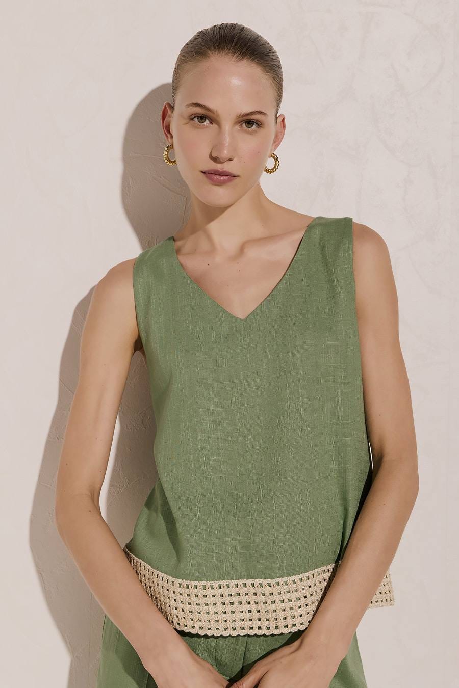 Η μπλούζα λινή με τρέσσα της Ds Boutique συνδυάζει φυσική κομψότητα και διακριτικό στυλ. Το λινό ύφασμα χαρίζει δροσιά και άνεση, ενώ η πλεκτή τρέσσα από δίχτυ προσθέτει ιδιαίτερη υφή και μοναδικό χαρακτήρα. Με τη χαλαρή της γραμμή, εφαρμόζει άψογα και αναδεικνύει τη θηλυκότητα με απλότητα.