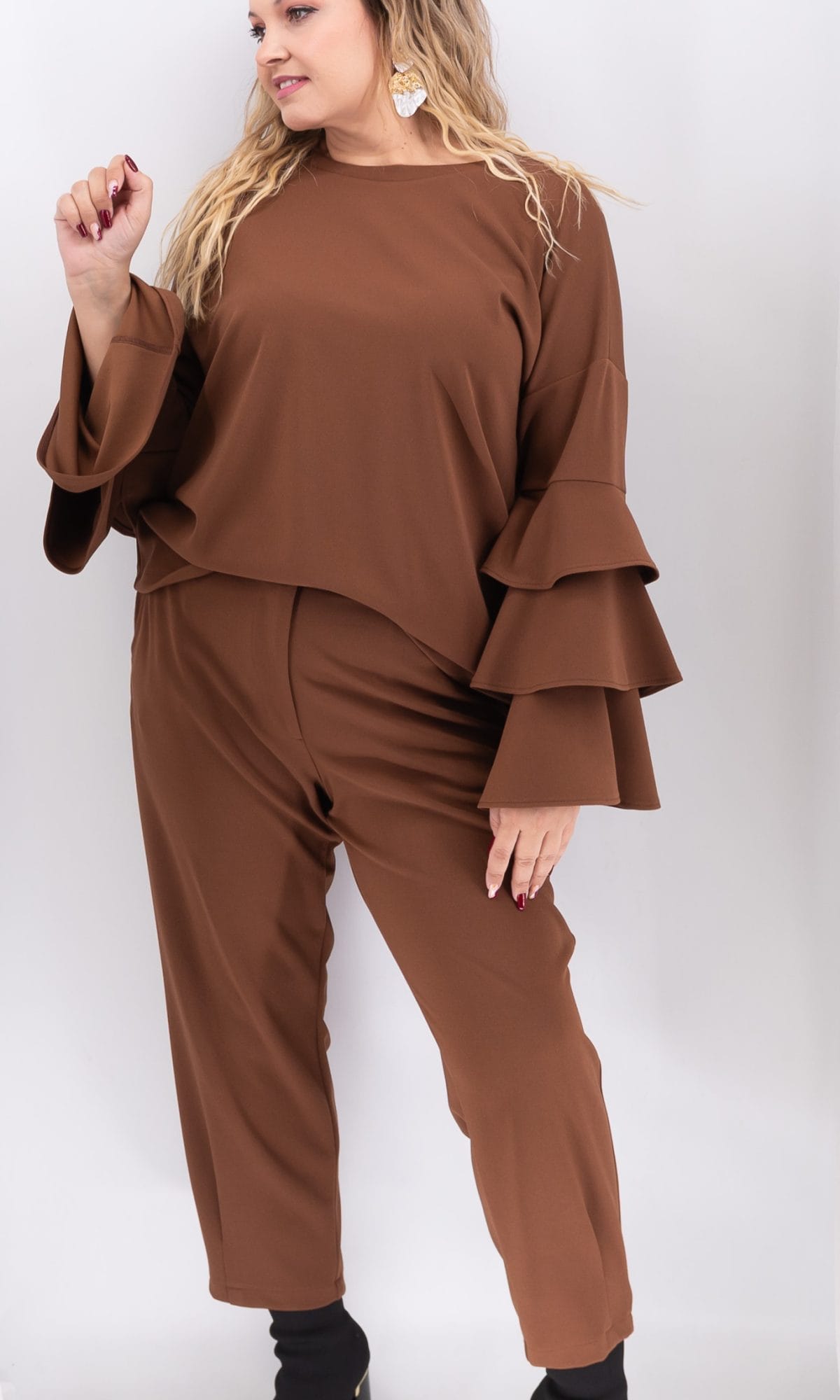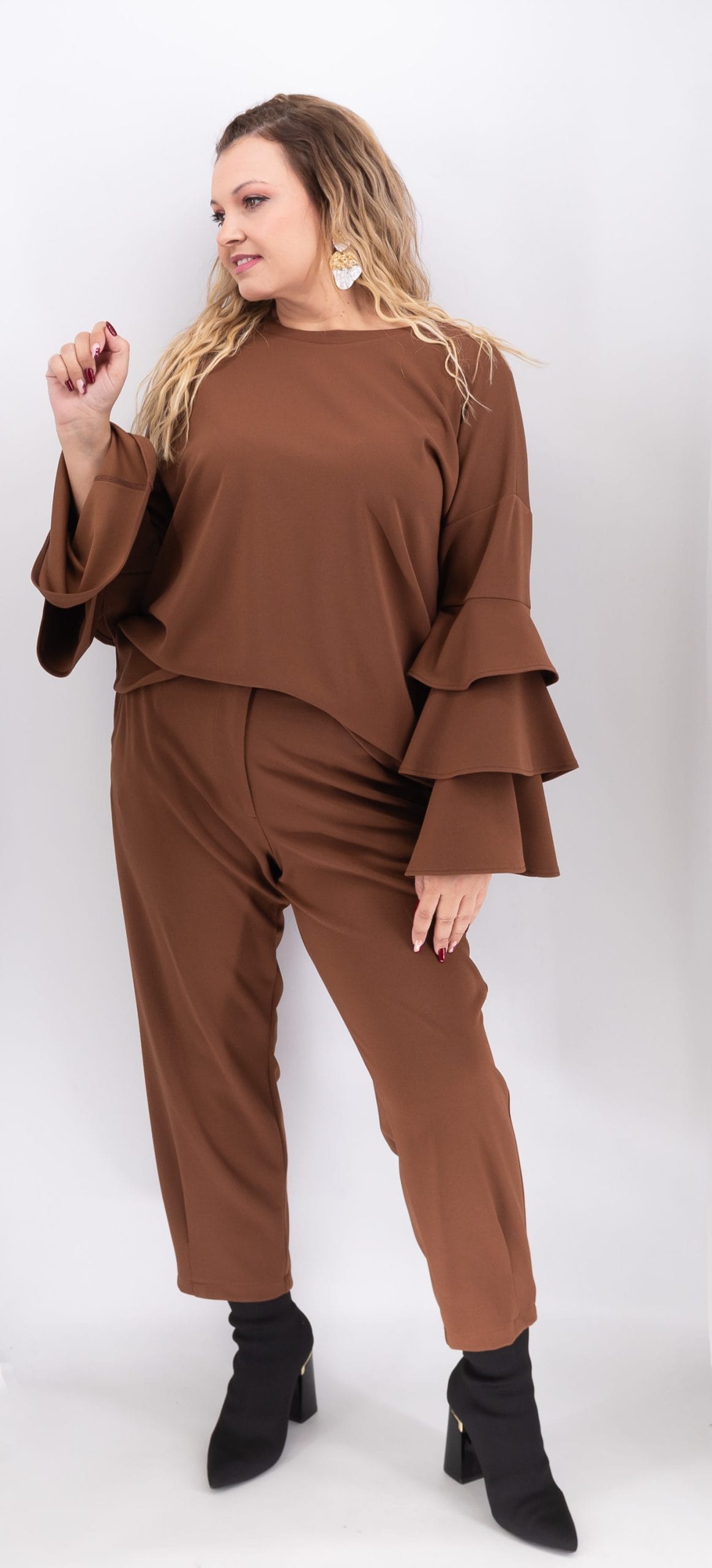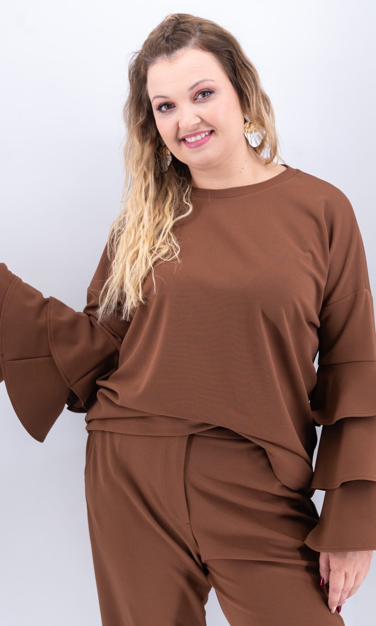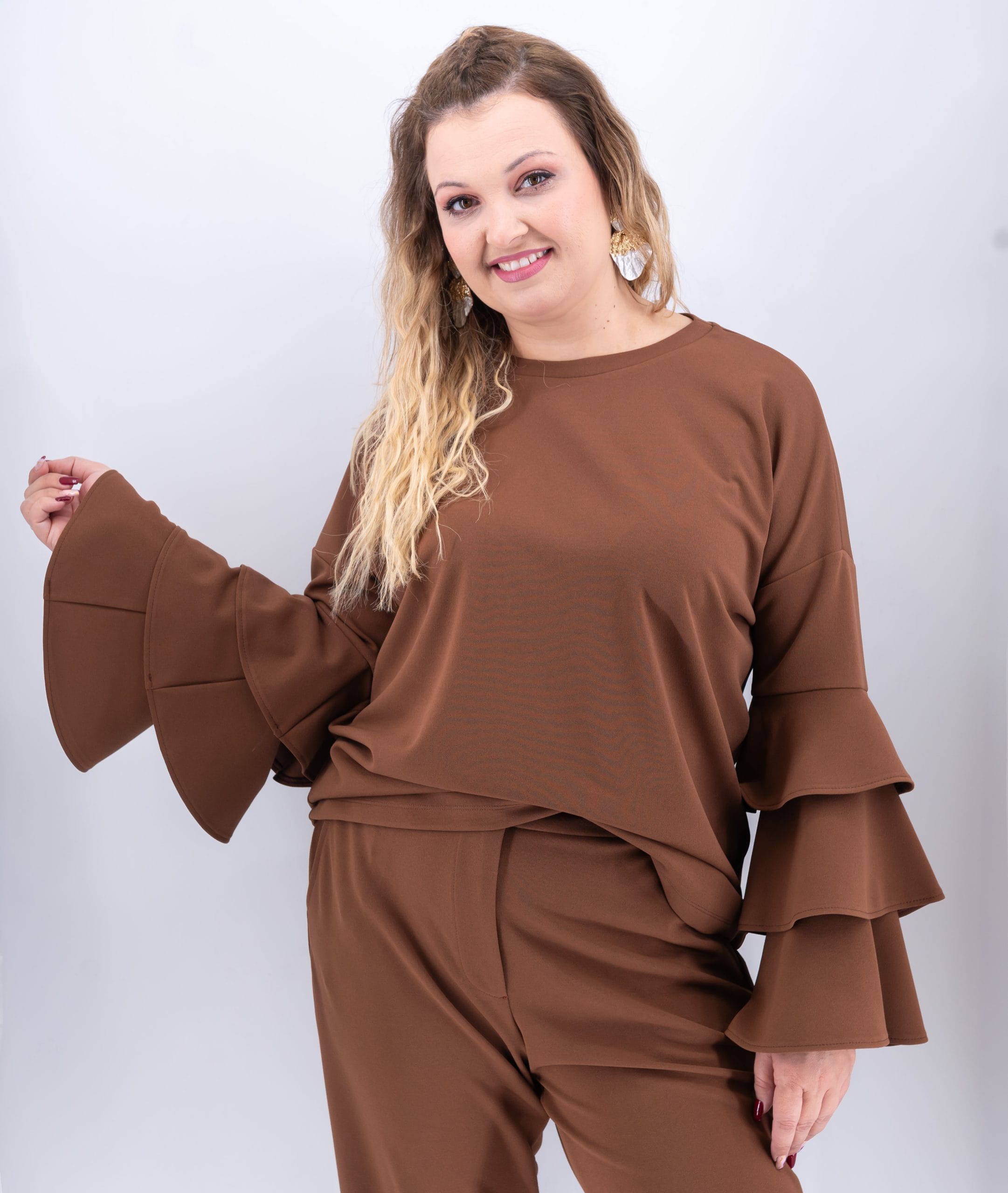 Η μπλούζα με βολάν στα μανίκια της Ds Boutique είναι μια κομψή επιλογή που συνδυάζει θηλυκότητα και άνεση. Κατασκευασμένη από ελαστικό ύφασμα (95% polyester – 5% spandex), εφαρμόζει όμορφα στο σώμα χωρίς να περιορίζει την κίνηση.