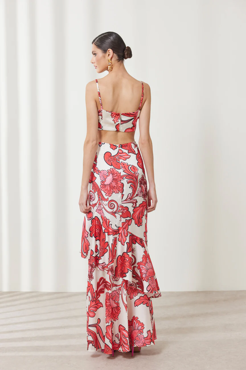 Εμπριμέ Μάξι Φόρεμα με Cut Out, Ρυθμιζόμενες Τιράντες & Βολάν