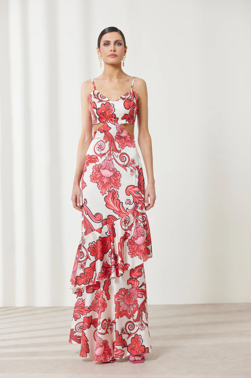 Εντυπωσιακό και κομψό, αυτό το εμπριμέ μάξι φόρεμα είναι ιδανικό για καλοκαιρινές εμφανίσεις και επίσημες περιστάσεις.