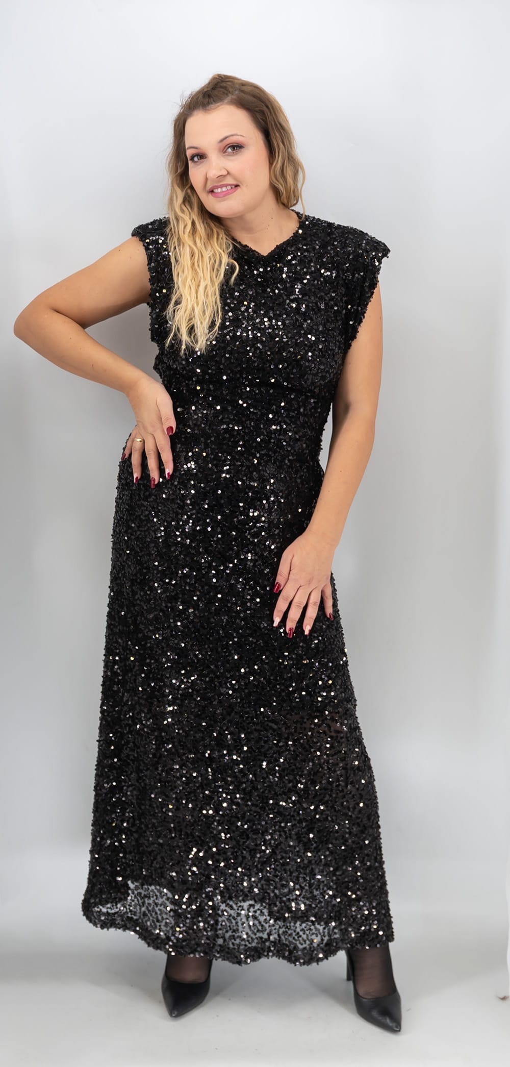 Η glossy γραμμή δημιουργεί καθαρή, πολυτελή λάμψη και δίνει πιο refined χαρακτήρα στο outfit. Επίσης, το φόρεμα ισορροπεί ανάμεσα στο σέξι και στο κομψό, γι’ αυτό και ταιριάζει ιδανικά σε ρεβεγιόν, γιορτινά events, πάρτι και ειδικές περιστάσεις. Παράλληλα, η παγιέτα λειτουργεί σαν “κόσμημα”, οπότε δεν χρειάζεσαι βαριά αξεσουάρ για να ολοκληρώσεις το look. Έτσι, κρατάς την εικόνα σου εκλεπτυσμένη και αφήνεις το φόρεμα να πρωταγωνιστήσει.