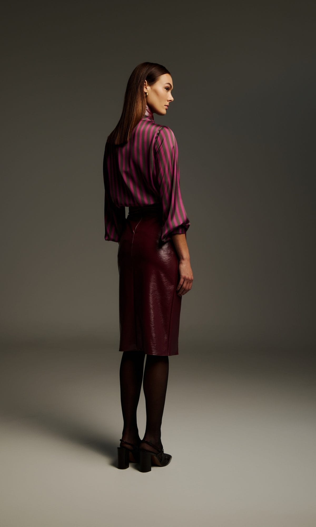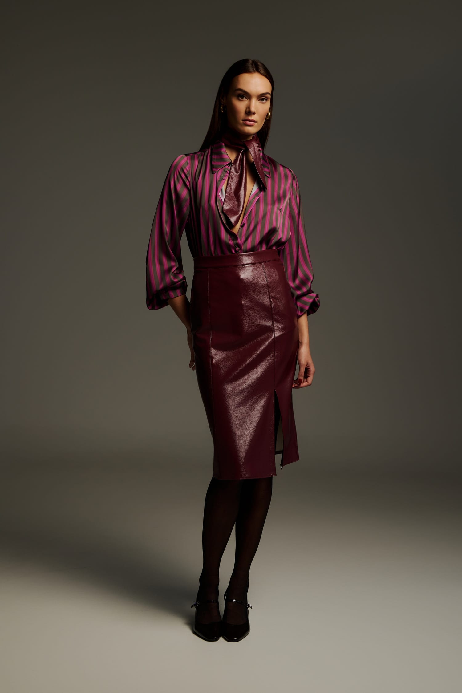 Αν θες ένα κομμάτι που δίνει αμέσως ένταση στο styling, διάλεξε φούστα δερματίνη γυαλιστερή σε pencil γραμμή. Το μαύρο eco-leather χαρίζει πολυτελή λάμψη, ενώ παράλληλα κρατά το αποτέλεσμα σύγχρονο και fashion-forward. Έτσι, δημιουργείς femme fatale εικόνα χωρίς υπερβολές. Επιπλέον, η pencil εφαρμογή αγκαλιάζει το σώμα και τονίζει τις καμπύλες με κομψό τρόπο.