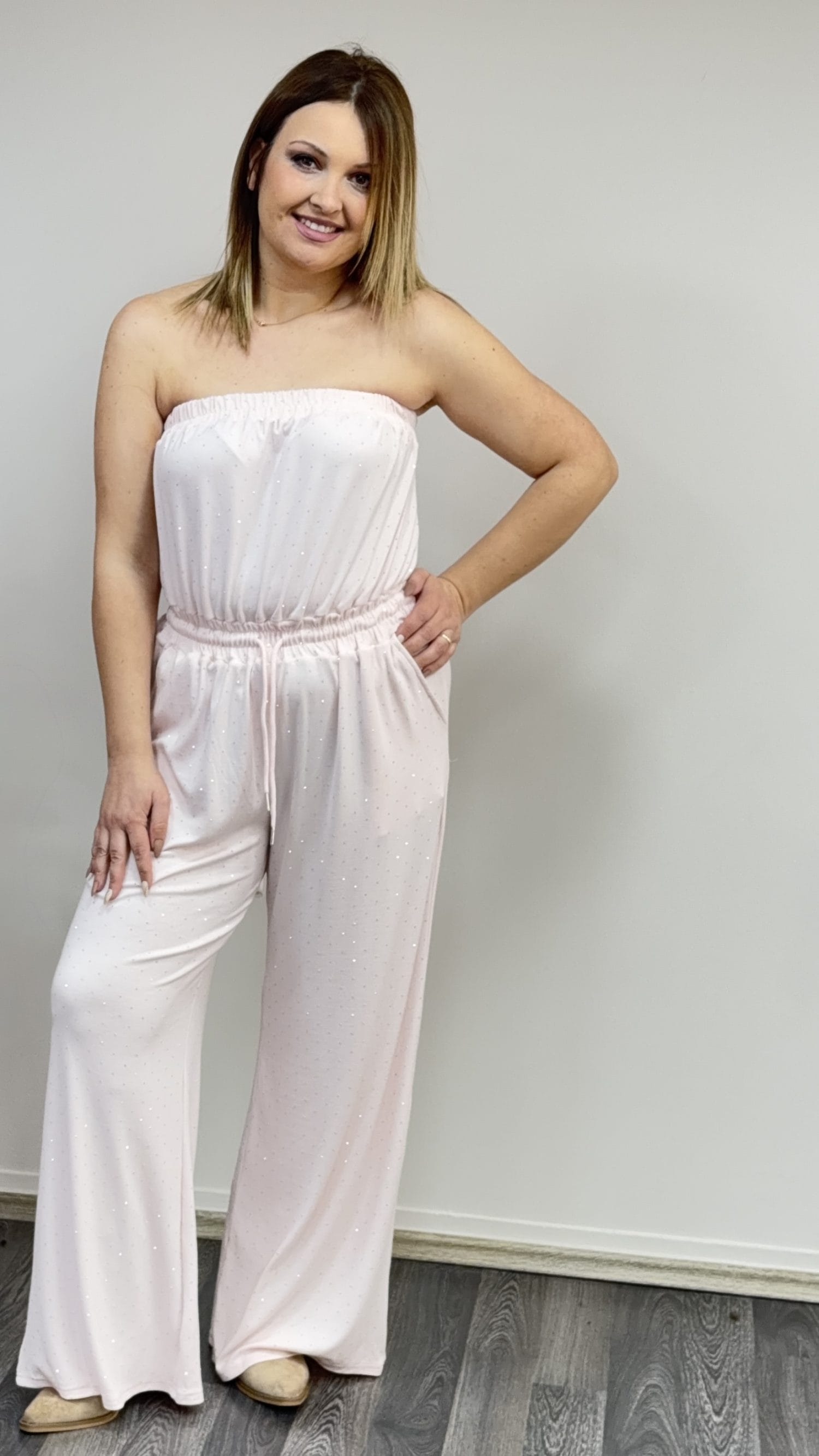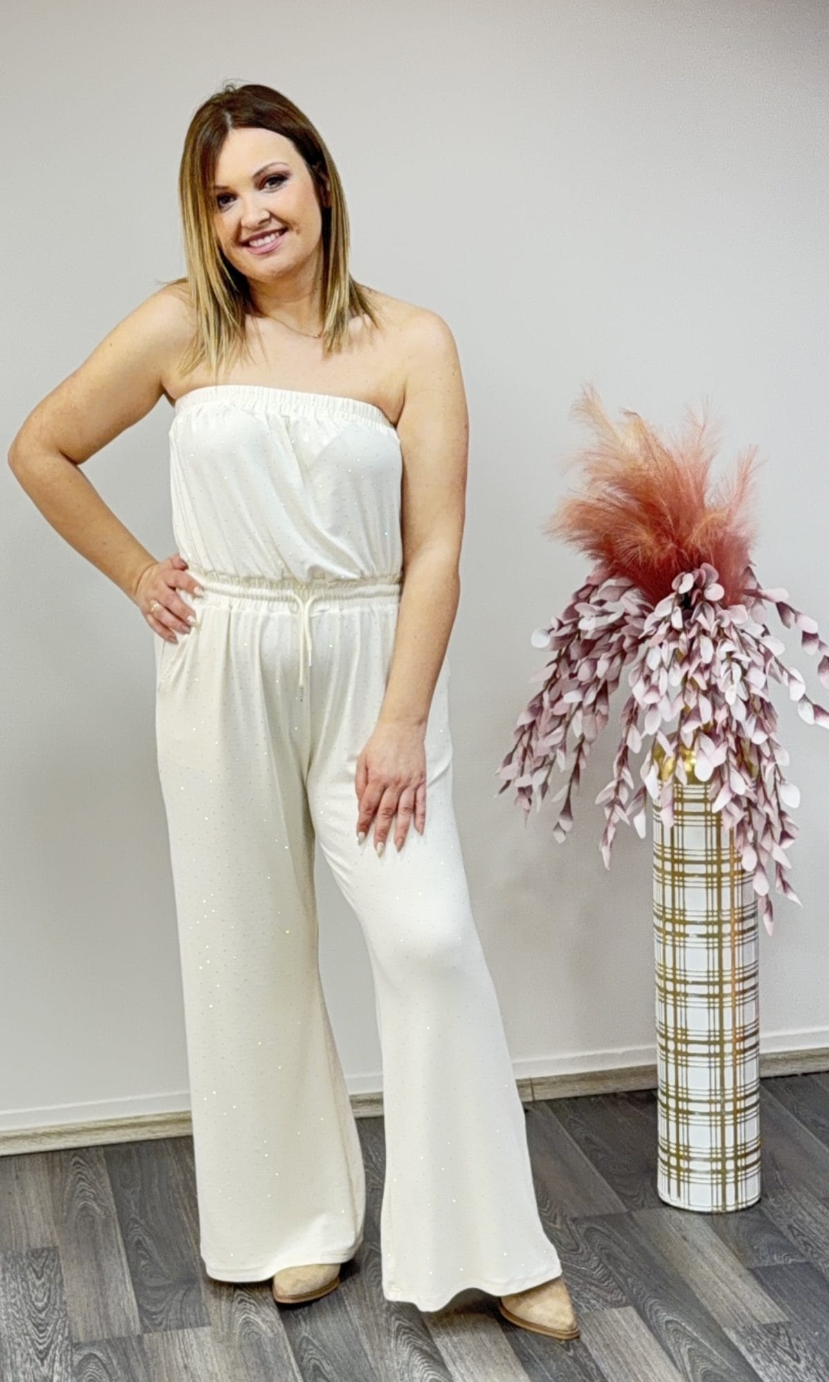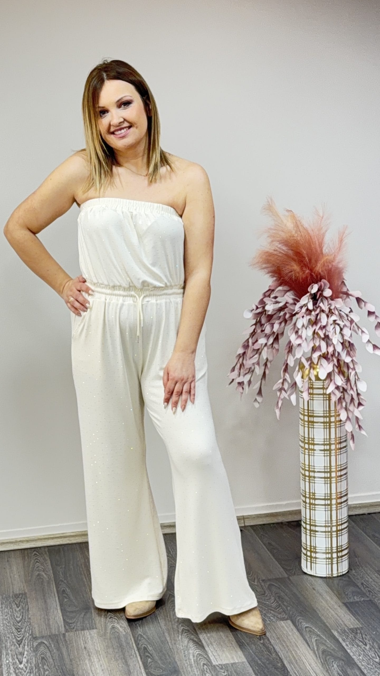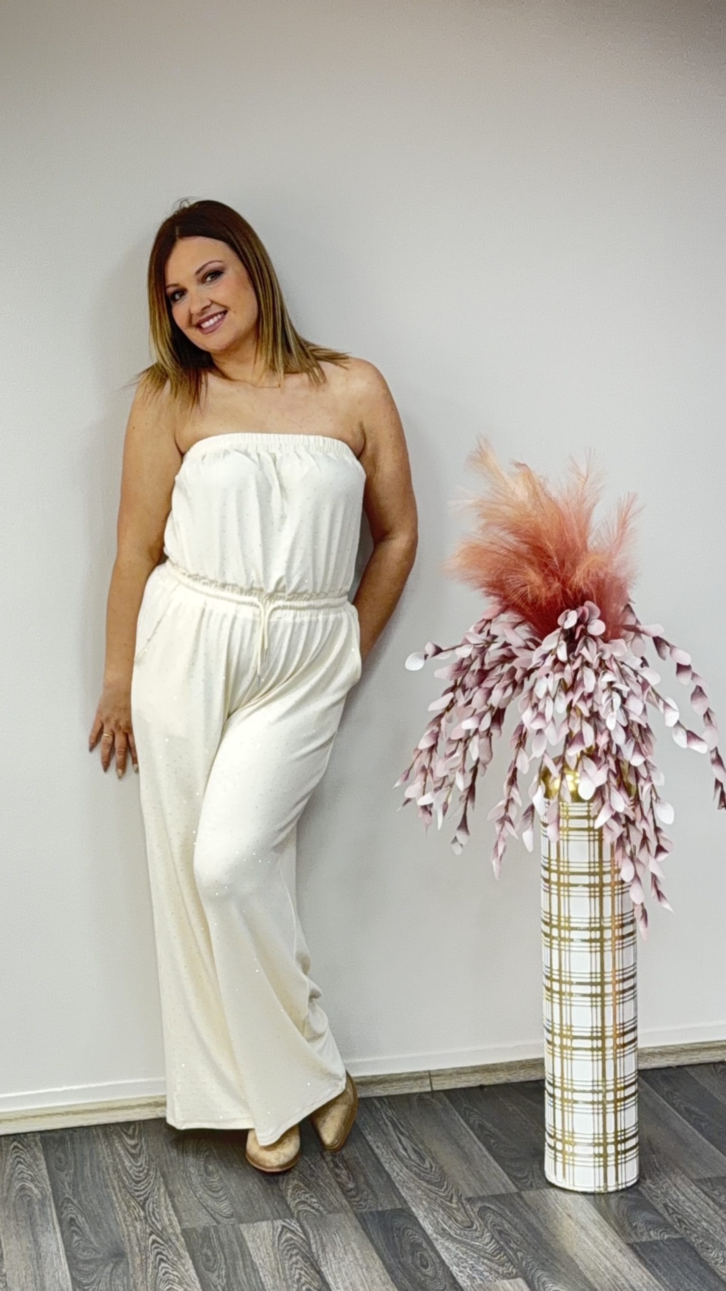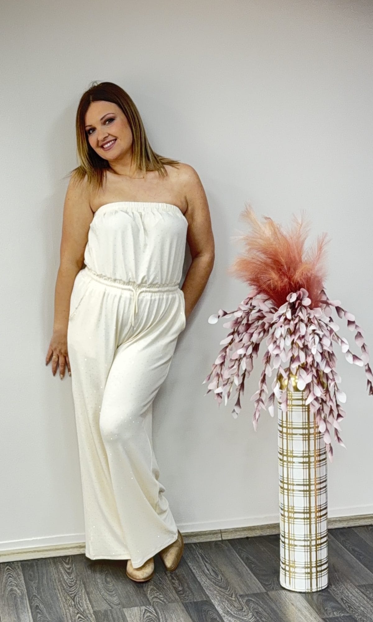 Η Ολόσωμη Φόρμα Strapless Με Λάστιχο Και Glitter Λεπτομέρειες είναι η απόλυτη επιλογή για κομψές αλλά και άνετες εμφανίσεις. Το strapless σχέδιο αναδεικνύει τους ώμους και χαρίζει θηλυκότητα, ενώ το λάστιχο στο μπούστο και στη μέση προσφέρει τέλεια εφαρμογή και άνεση καθ’ όλη τη διάρκεια της ημέρας. Η ίσια, αέρινη γραμμή στο παντελόνι δημιουργεί ένα elegant αποτέλεσμα που κολακεύει κάθε σιλουέτα. Οι διακριτικές glitter λεπτομέρειες δίνουν μία subtle λάμψη που κάνει τη φόρμα ιδανική τόσο για καθημερινά looks όσο και για πιο ιδιαίτερες περιστάσεις. Συνδυάζεται εύκολα με σανδάλια, sneakers ή πέδιλα για ολοκληρωμένα outfits.