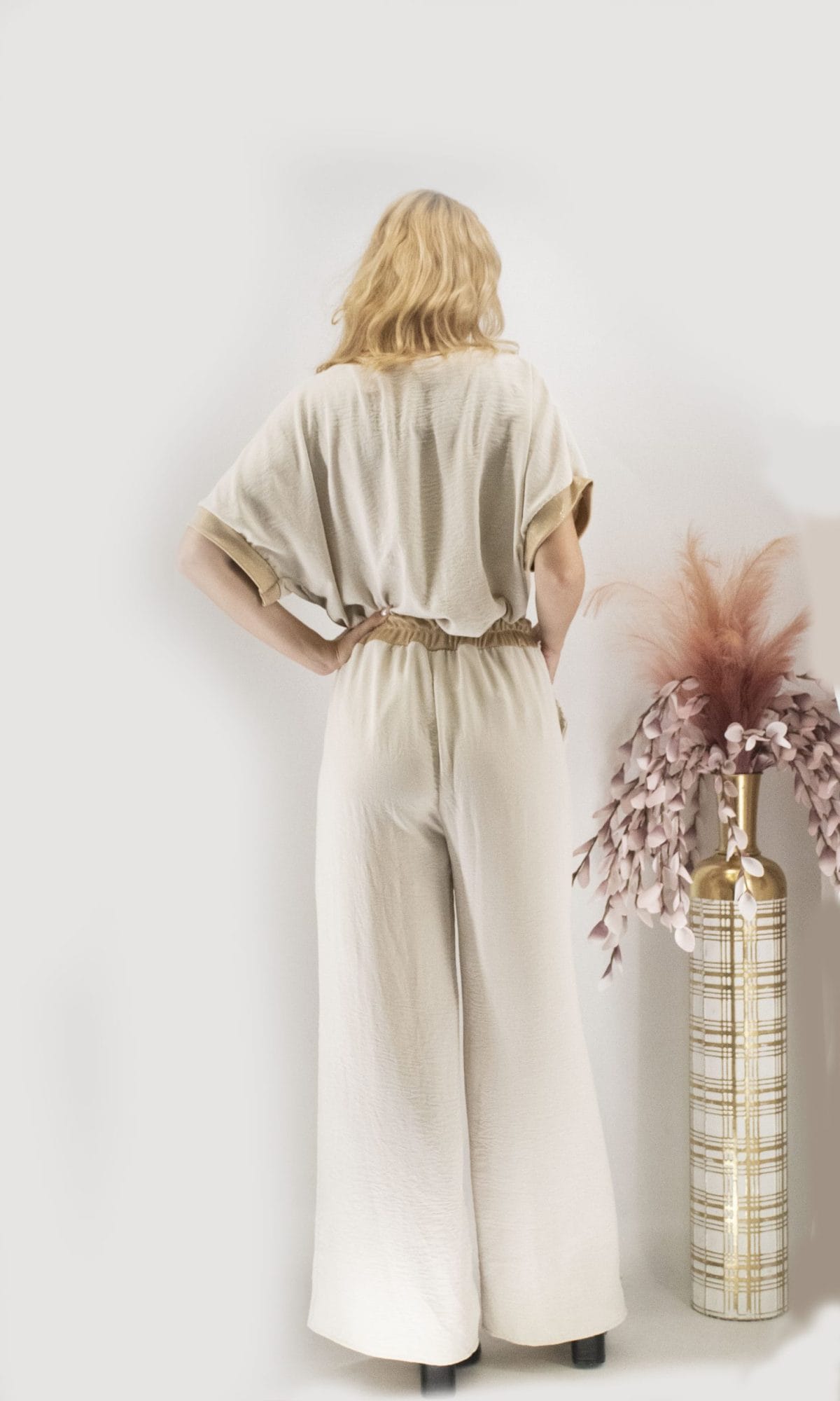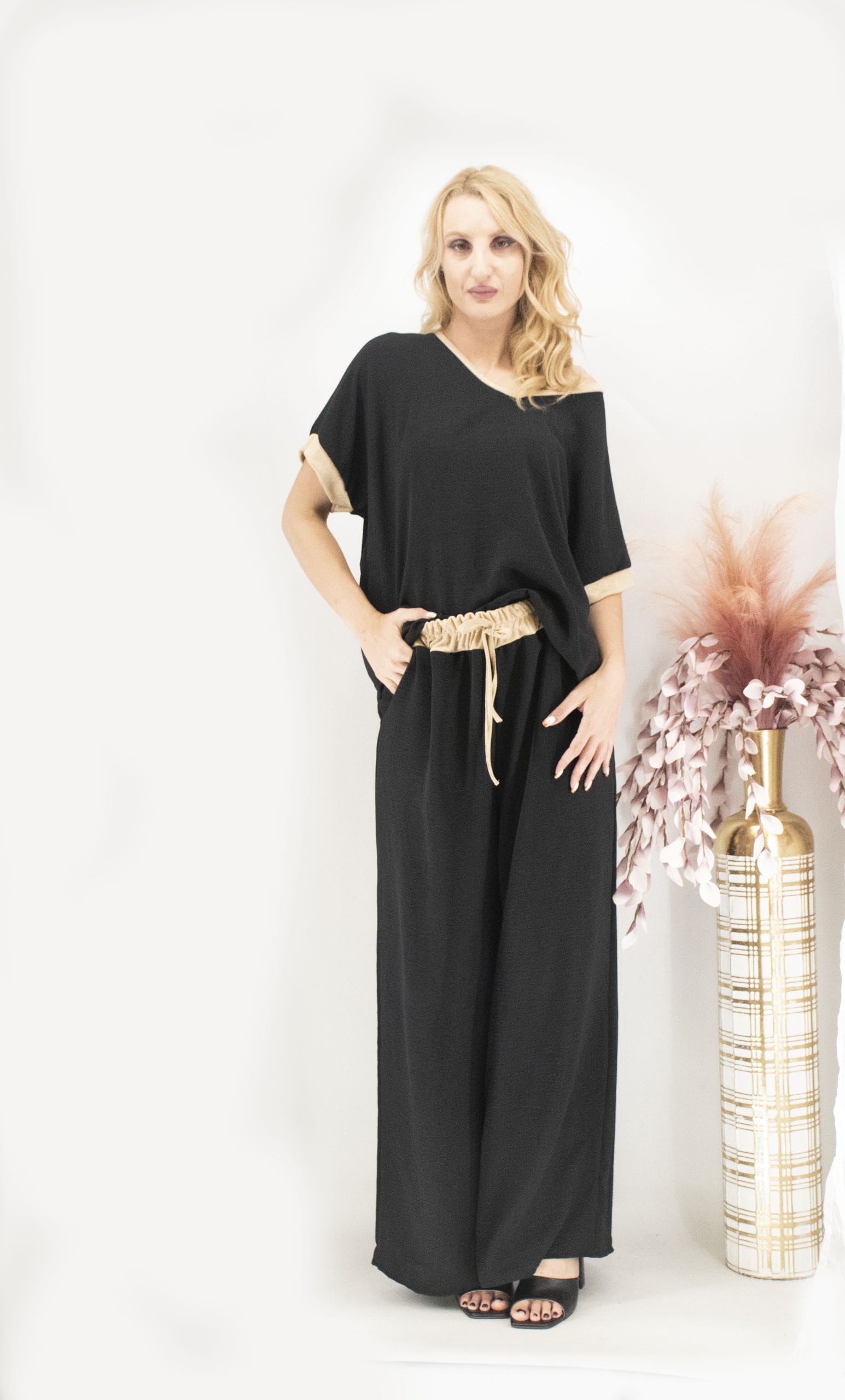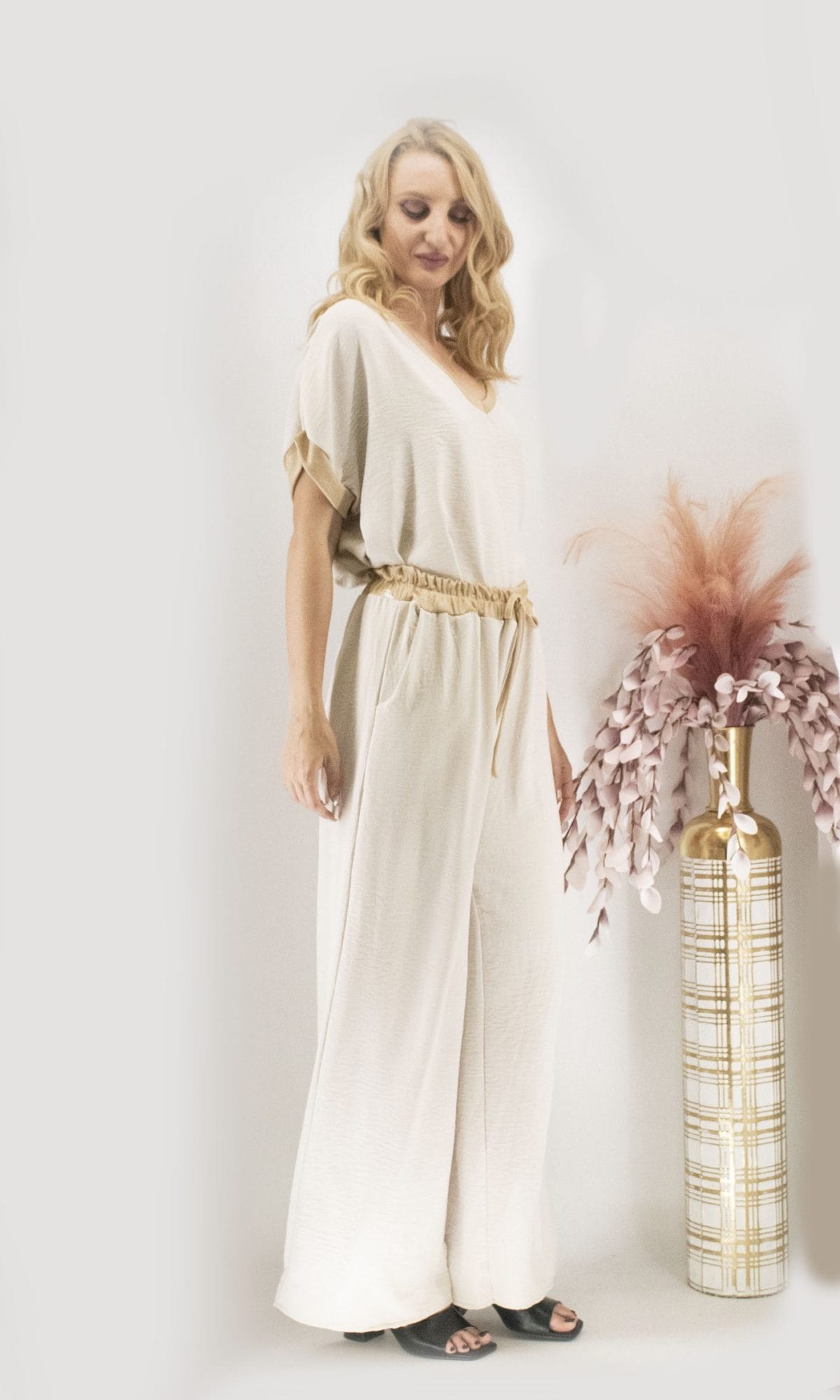 Το σέτ με παντελόνι και μπλούζα της Ds Boutique αποτελεί ολοκληρωμένο outfit που συνδυάζει άνεση και στυλ. Το παντελόνι χαρίζει αέρινη κίνηση, ενώ η μπλούζα ολοκληρώνει το look με minimal κομψότητα. Επίσης το ελαφρύ ύφασμα εξασφαλίζει δροσερή αίσθηση και άνετη εφαρμογή σε όλη τη διάρκεια της ημέρας.